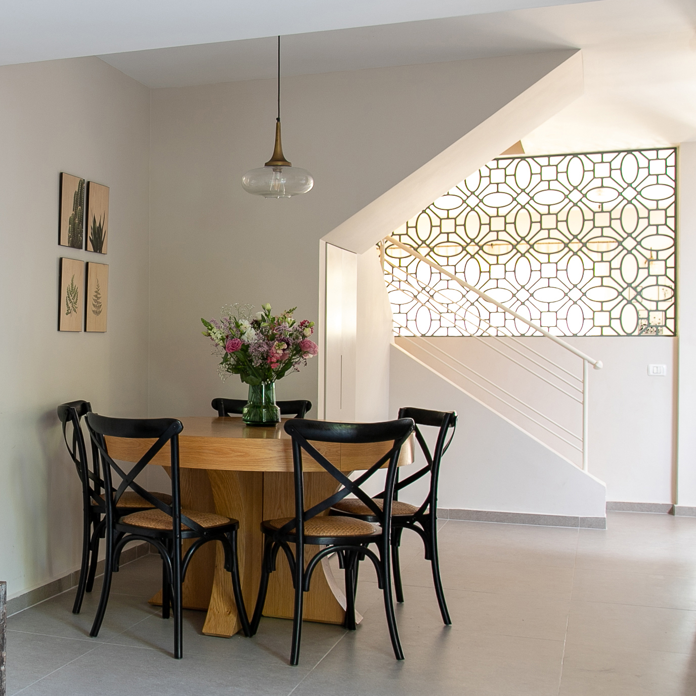 למטבח ופינת האוכל. עם זאת, נשמר קשר עין ומעבר של אור בין החללים והוא מעין תכשיט אשר מדבר בשפה העיצובית של הבית והותאם לפלטת הצבעים שלו.