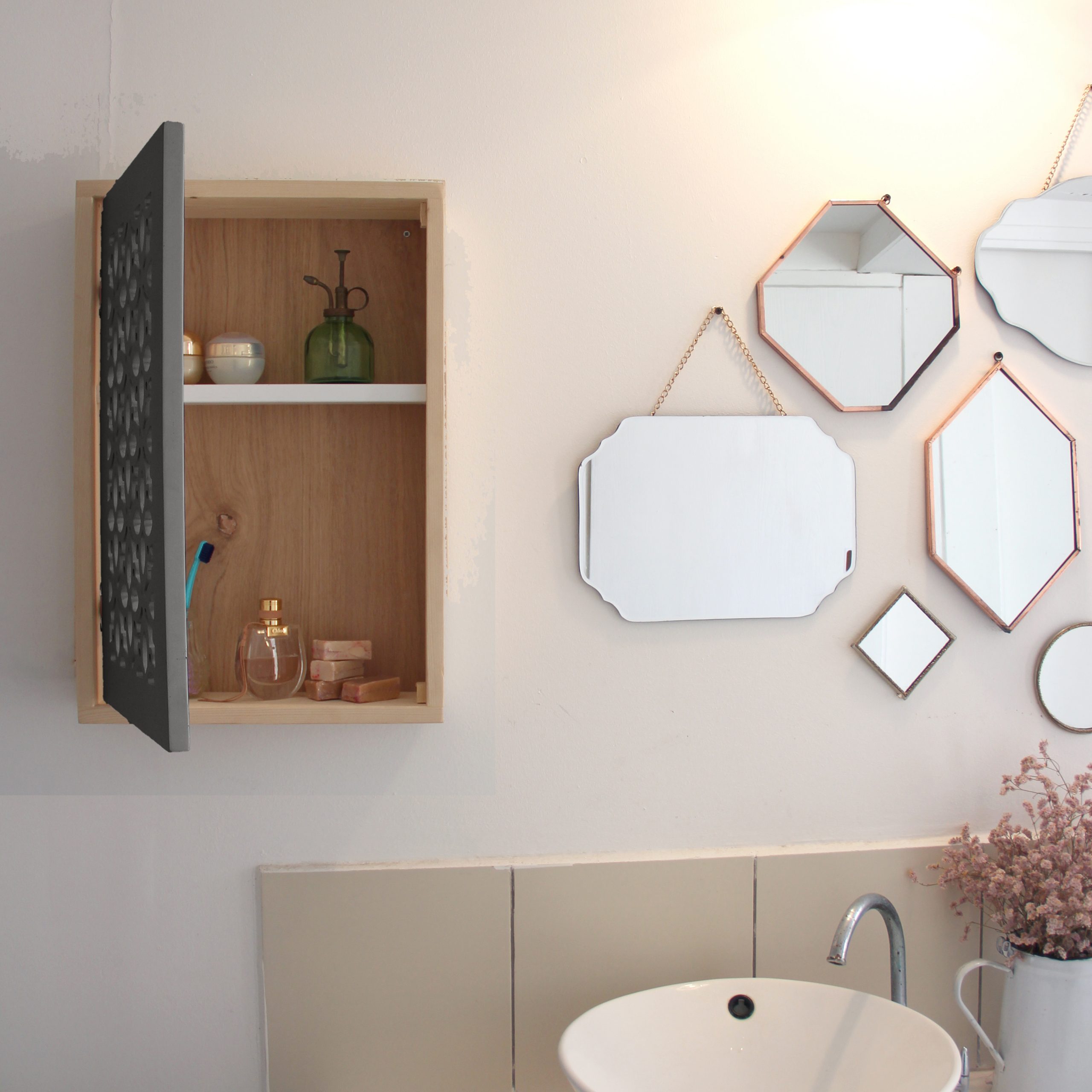 ארון קיר עם מדף יחיד בעל פרופורציה מושלמת, דלתות עץ חרוטות היוצרות עומק ומרקם,