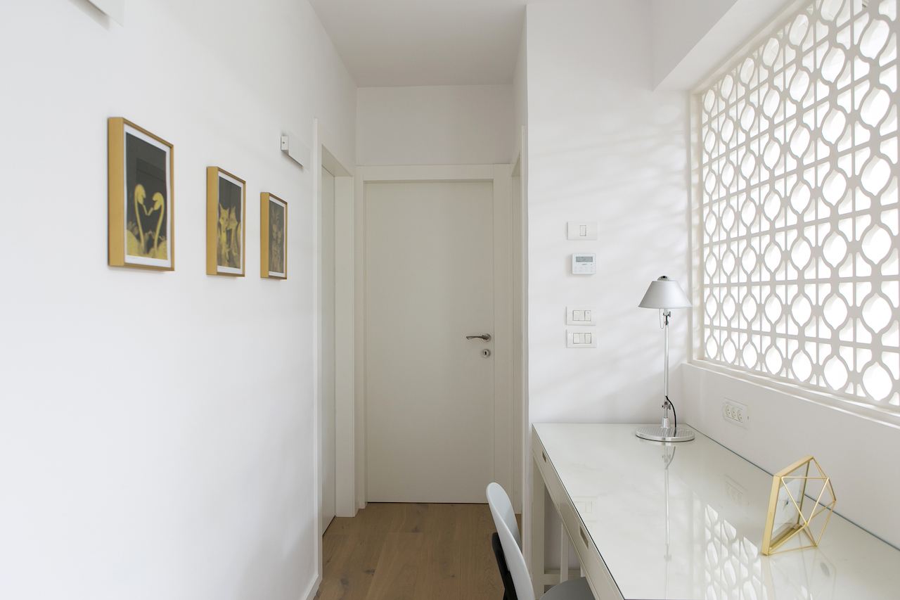 במקום שהמסדרון שמוביל לחדרים יהיה צר ואפל, עמדת עבודה עם מחיצת דקובריק, שמכניסה אור ואוויר, יוצרת צללים מהפנטים.