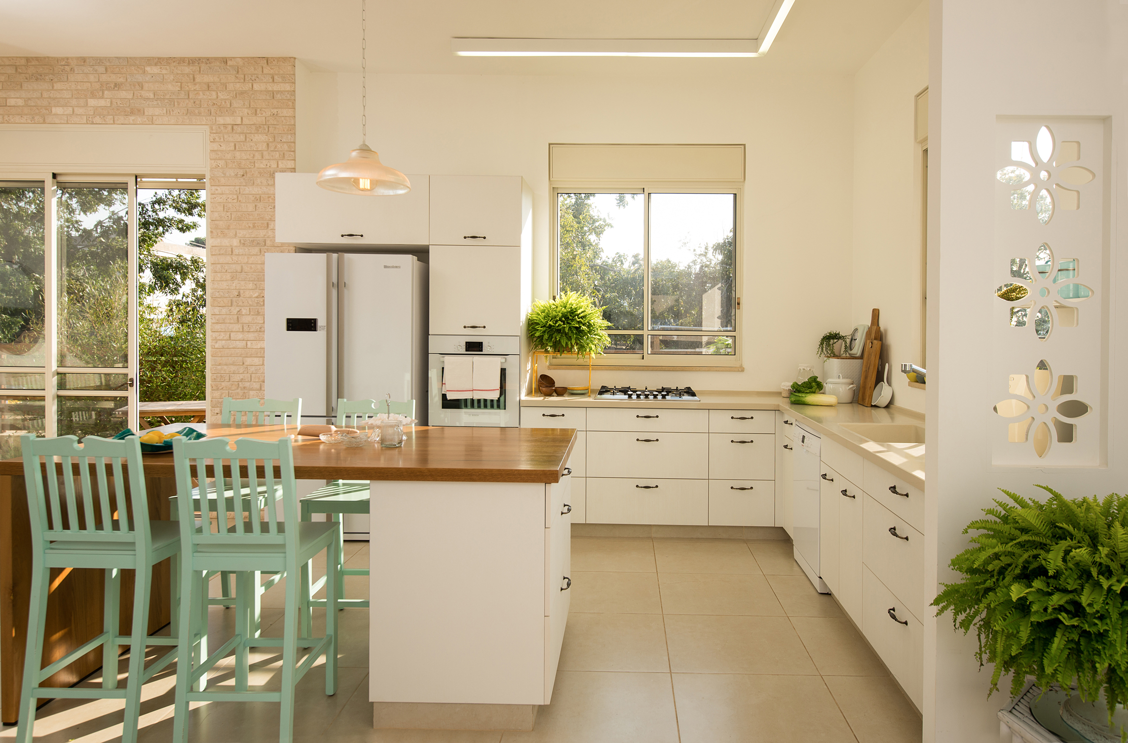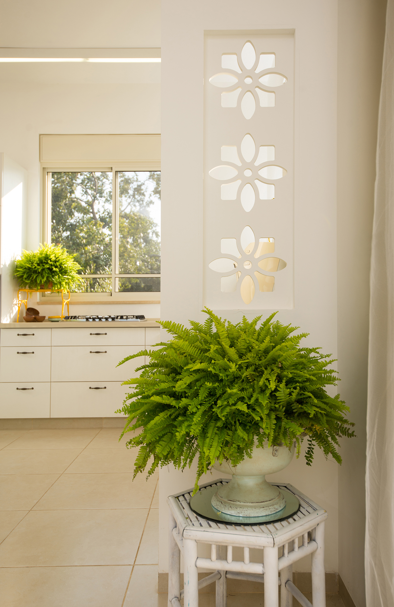 מאחורי שלושת הפרחים המגולפים מסתתרים החלקים הפחות יפים במטבח (כגון החוטים של מכשירי החשמל), ועדיין שומרים על מעבר של אור, אויר וקשר עין עם יתר הבית תוך שמירה על מראה מסודר ויפה.